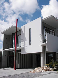 ピロティ−と土間玄関は風を導く伝統的工夫で構成された。それから空へ向けられた赤い垂直柱は、赤瓦屋根へのオマ−ジュ(敬意)であり、ヒンプンの役割も果たしてくれる。